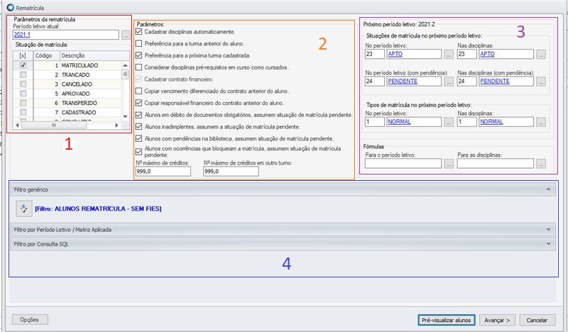 Nesta tela é possível visualizar quem é o próximo período letivo e pré-visualizar os alunos que serão considerados na rematrícula.