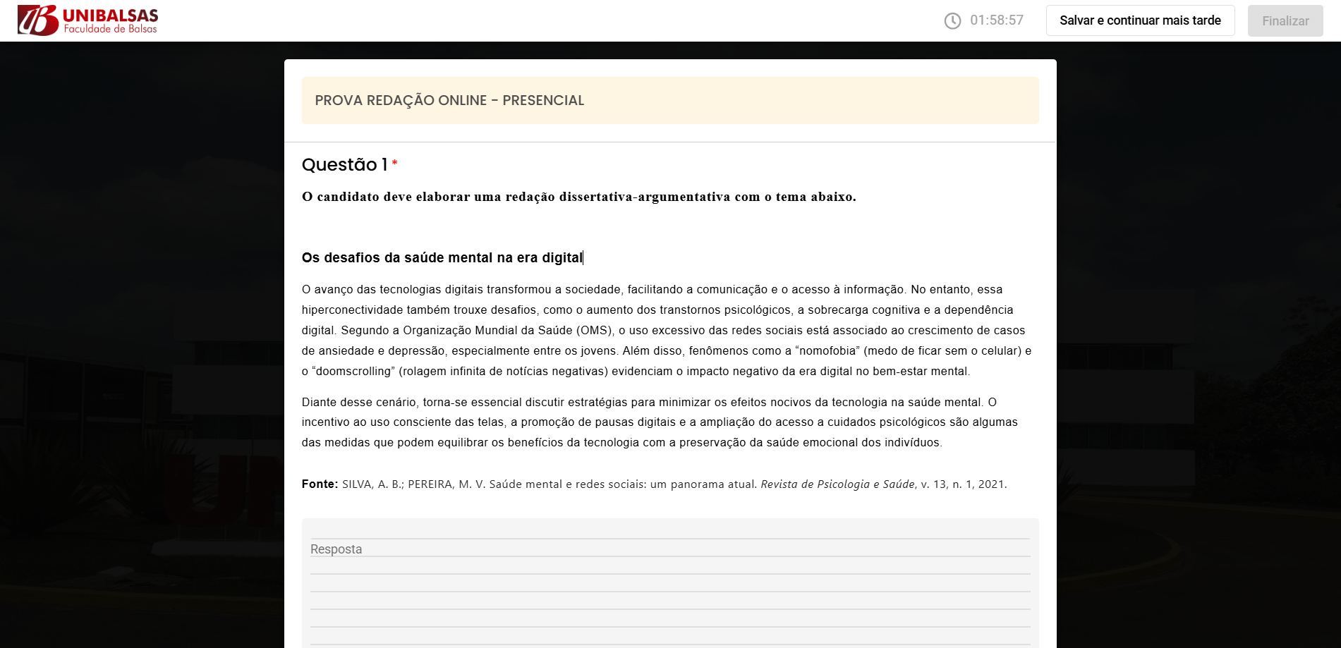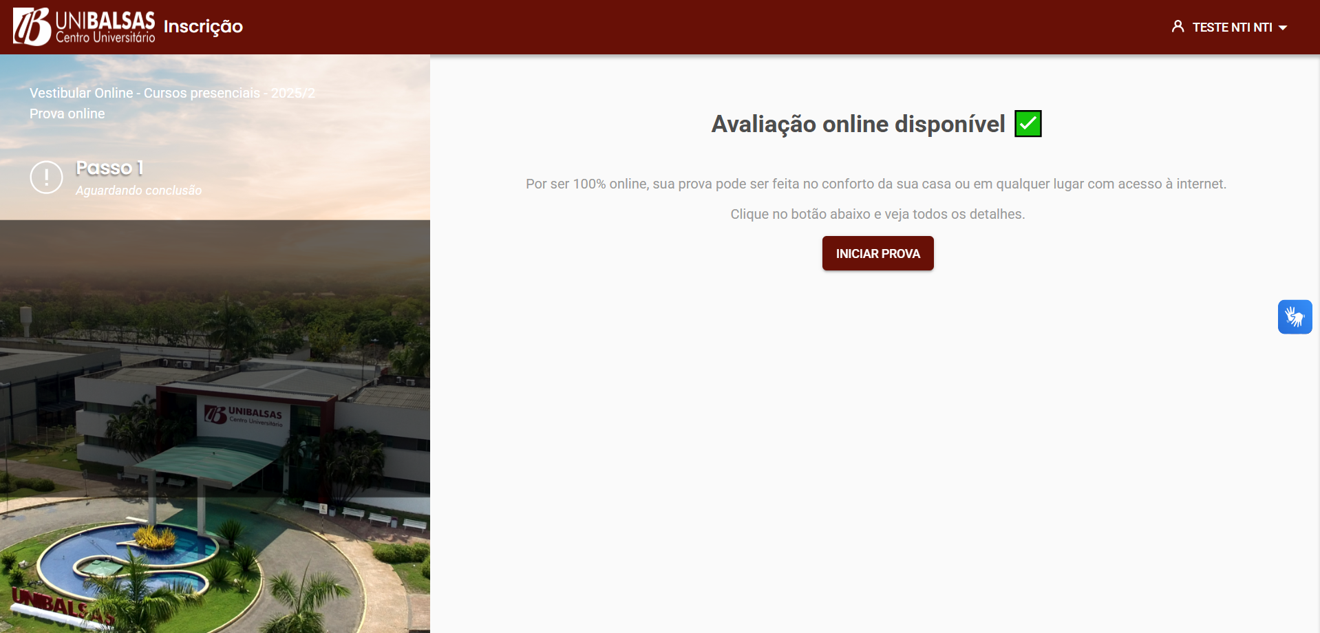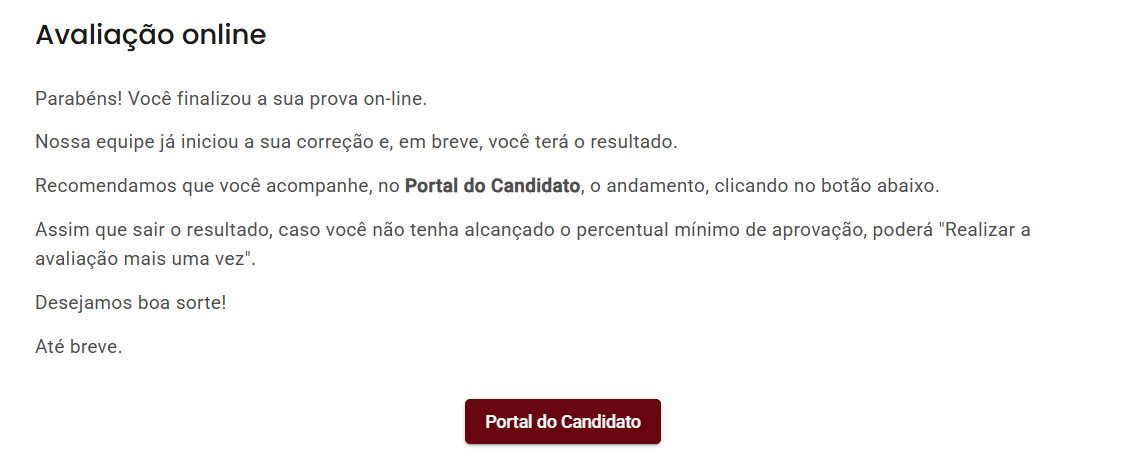 Ao pressionar o botão de "Realizar prova" o candidato é redirecionado para uma tela de Iniciar prova, Informação da avaliação online e a redação.