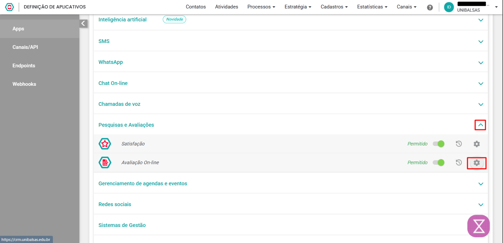 Ao acessar a tela, aperte na seta para baixo da "Pesquisas e Avaliações", e logo após, aperte no botão em formate de engrenagem: