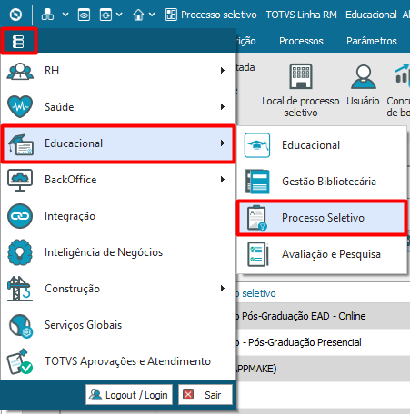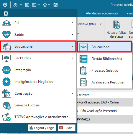 Para fazermos a Pré-matrícula por dentro do RM, precisamos acessar o modulo Educacional 🡪 Educacional, logo após aperte na aba "Matrícula e Avaliação", depois aperte em "Processo Seletivo (RM)" 🡪 "Matricular".