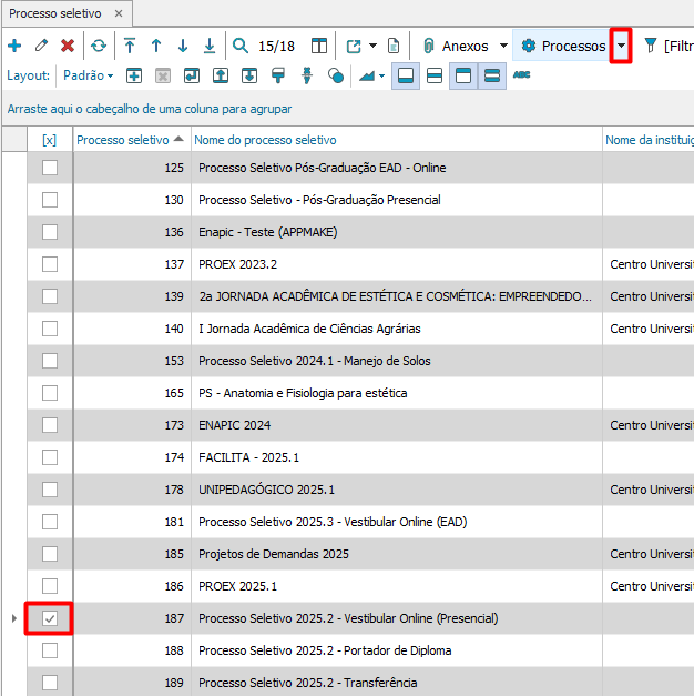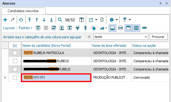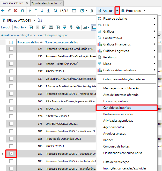 Para adicionarmos a filiação, precisamos marcar o processo seletivo e logo após apertar em "Anexo" e depois "Candidatos inscritos".