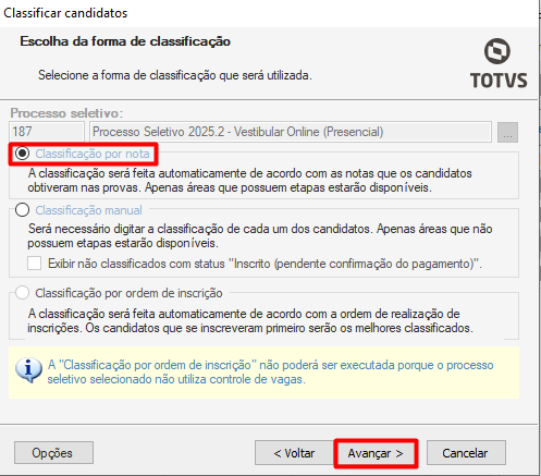 Masque a opção: "Classificação por nota" e aperte em avançar "Avançar".