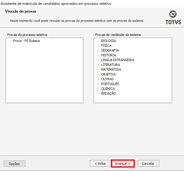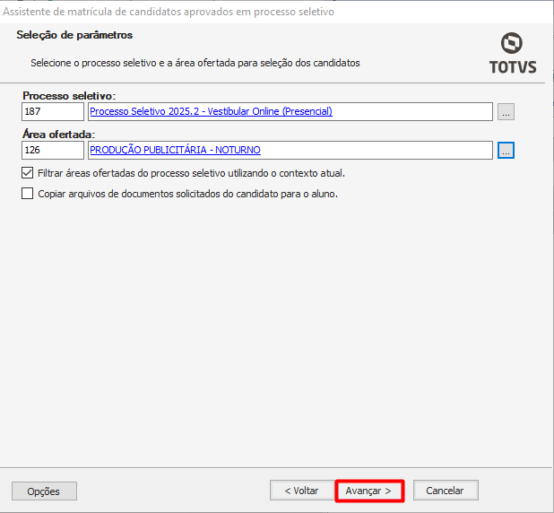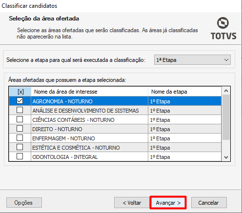 Então aparecerá a tela de seleção da área de interesse do candidato, escolha a área de interesse correta do candidato que você quer classificar, e depois aperte em "Avançar".
