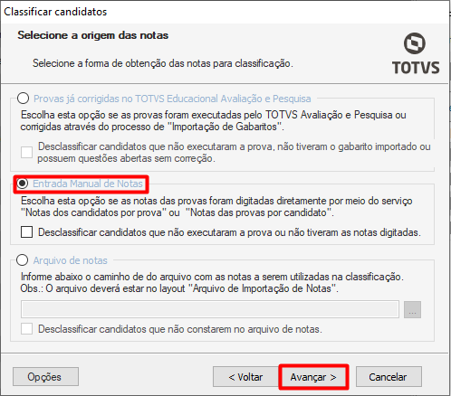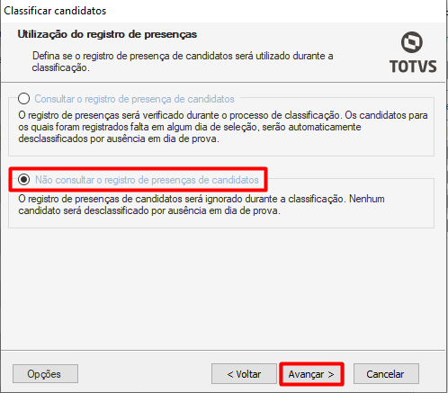 E na ultima etapa do processo de classificação, marque a opção: "Não consultar o registro de presenças de candidatos" e aperte em "Avançar".