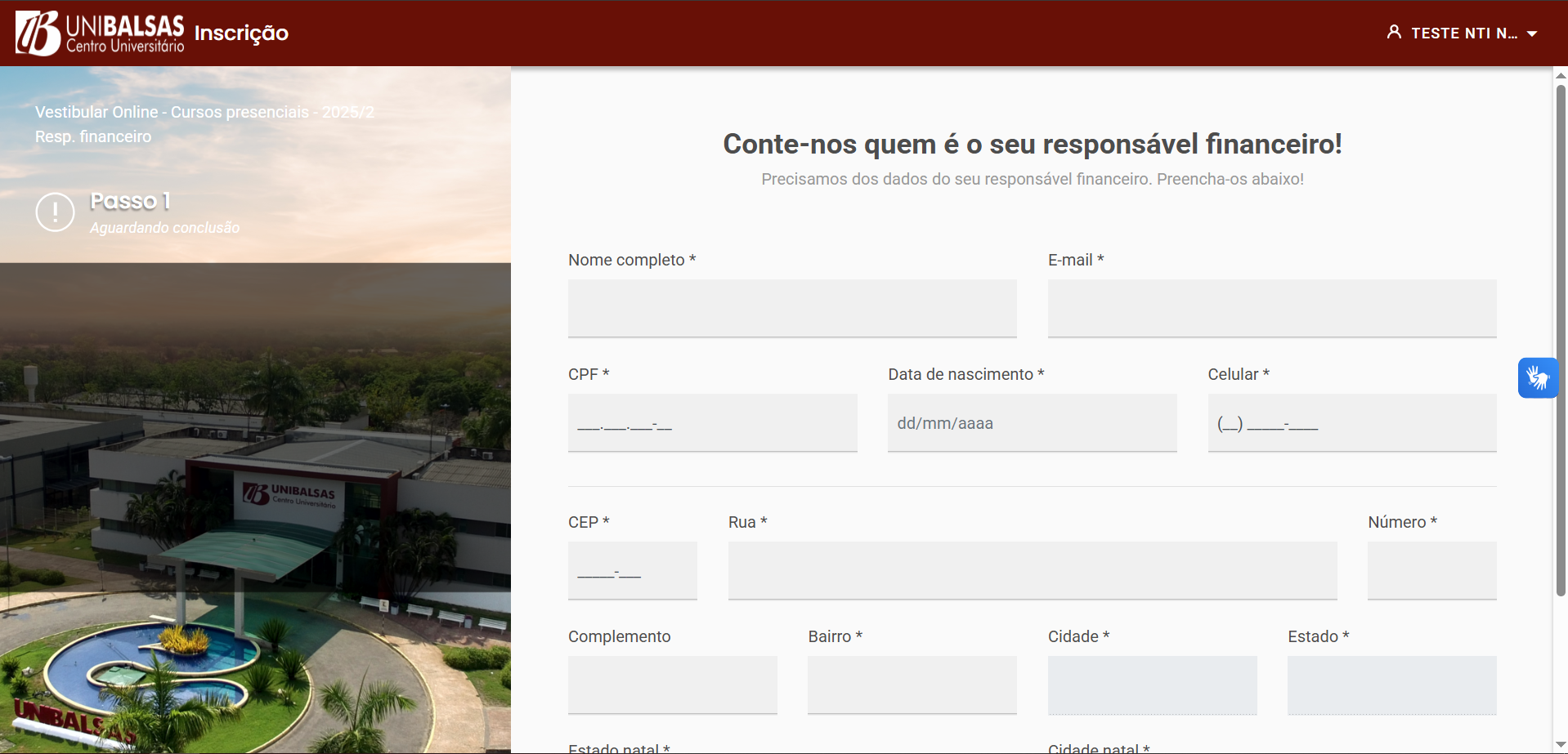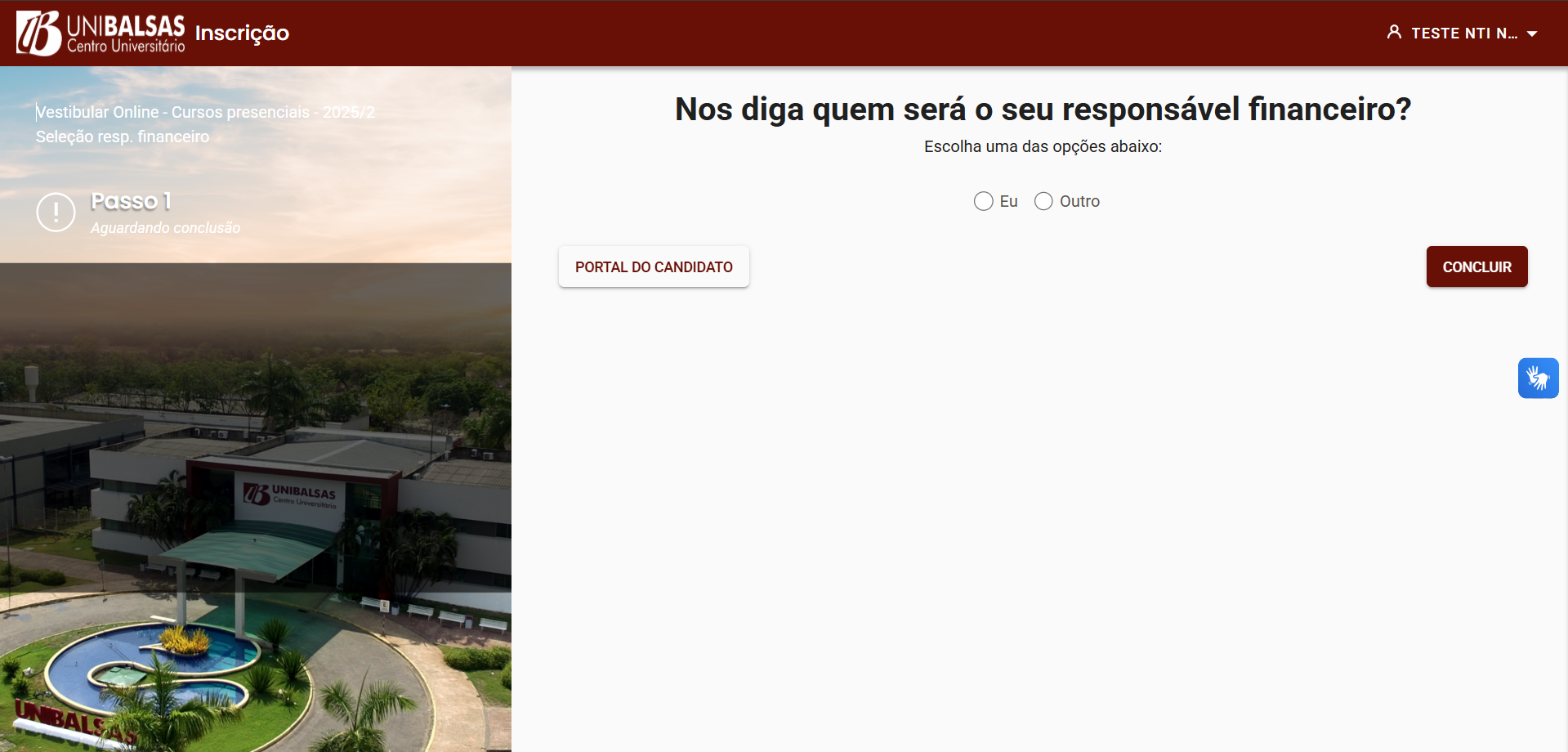 *obs: Para candidatos menores de idade não apere essa opção de seleção de responsável financeiro.