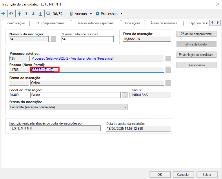 Esse tela mostra algumas informações básicas de inscrição do candidato