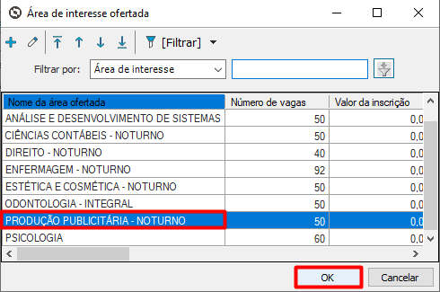 Selecione a área de interesse do candidato que você quer pré-matricular.