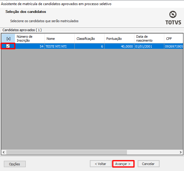 Então aparecerá essa tela, mostrando algumas as informações do candidato, e para seguirmos precisamos selecionar o candidato que queremos pré-matricular e depois apertar em "Avançar".