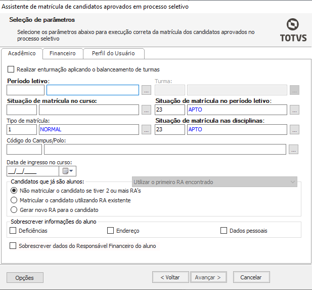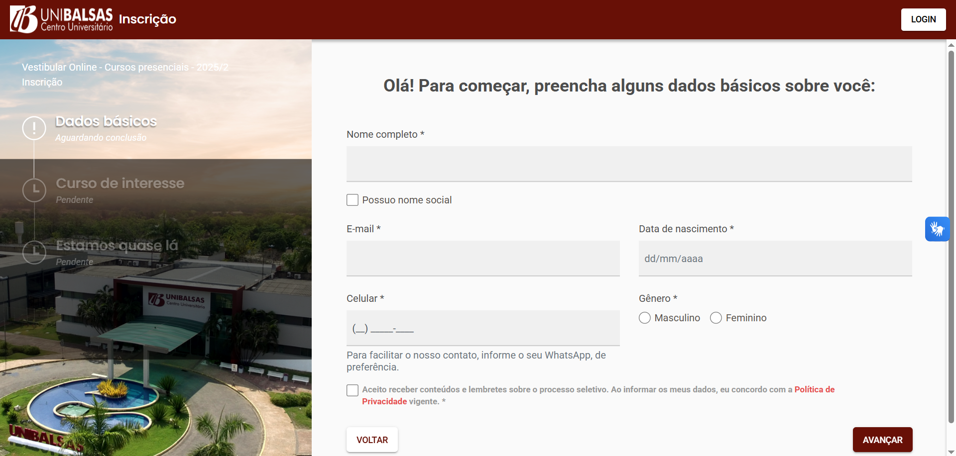 Então aparecerá essa tela, nela precisamos fazer algumas configurações para que possamos inscrever o candidato corretamente.