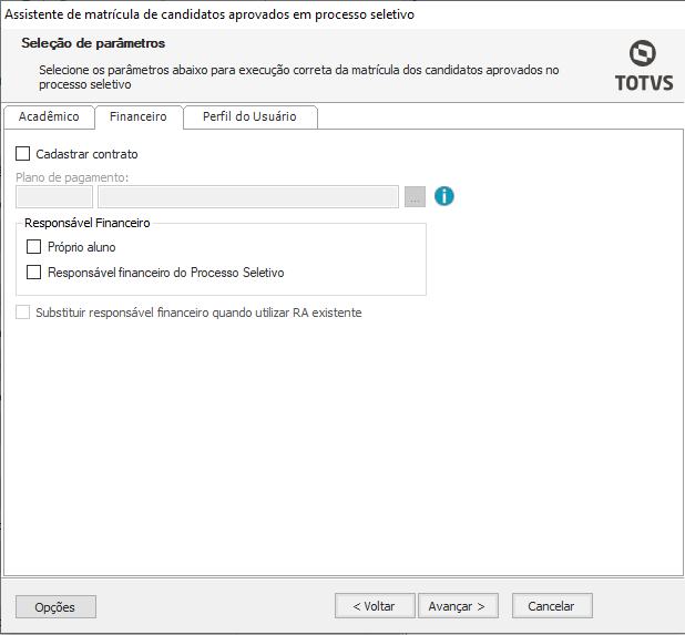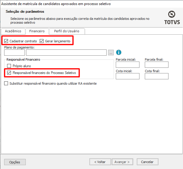 Primeiramente vamos marca algumas opções, sendo elas: "Cadastrar contrato", "Gerar lançamento" e "Responsável financeiro do Processo Seletivo".