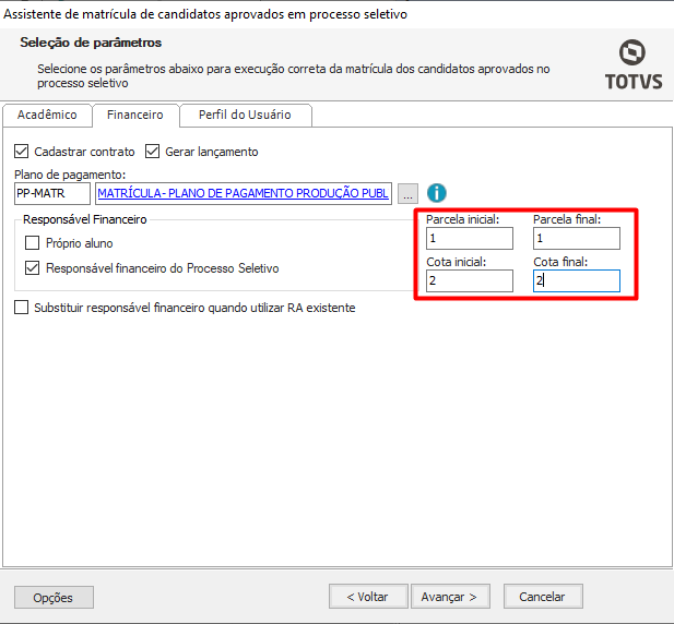 A opção "Seleção resp. financeiro" não aparece antes de fazer todo o processo de classificação e chamada.