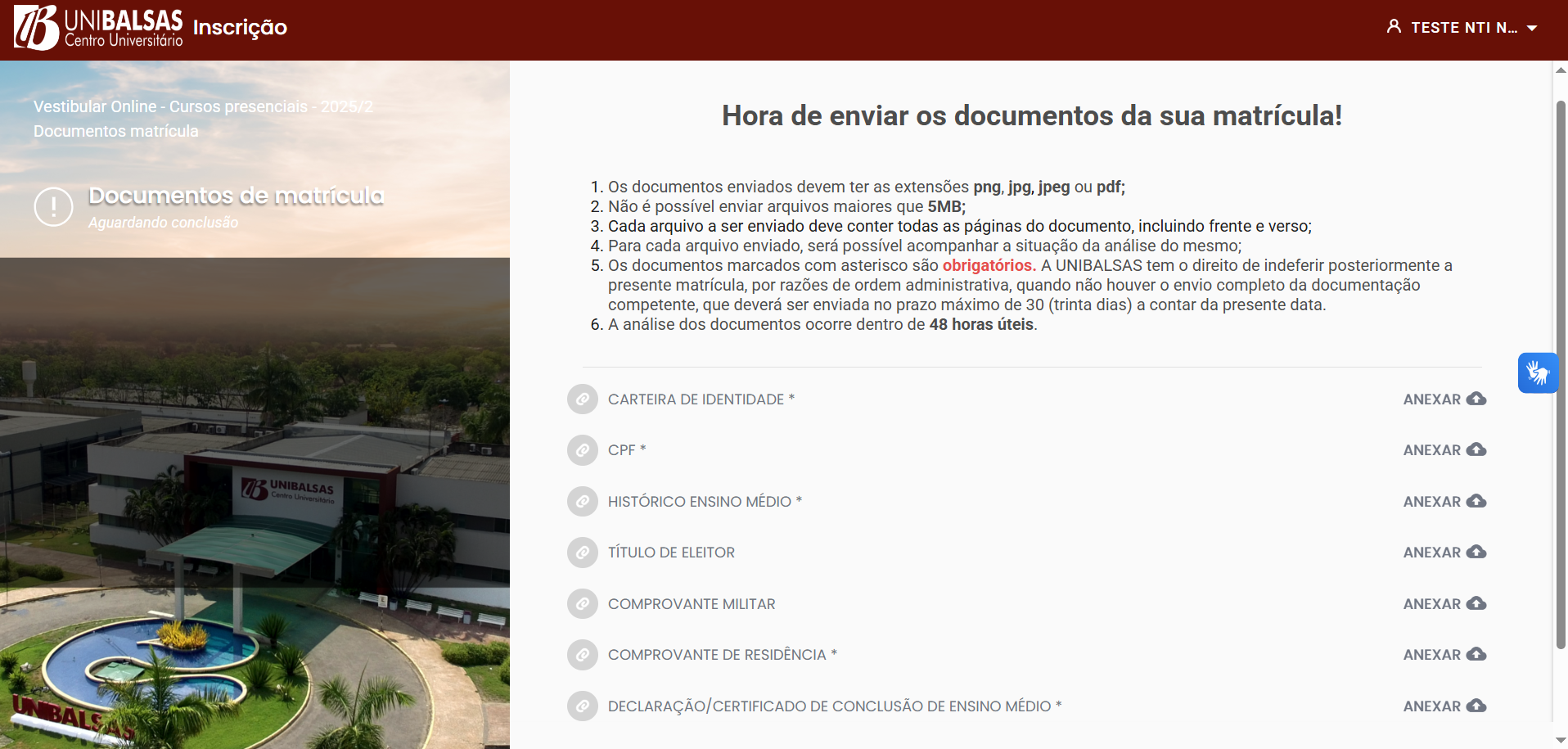 Ao apertar no botão "Verificar", será apresentado uma tela, onde o candidato precisa enviar os documentos.