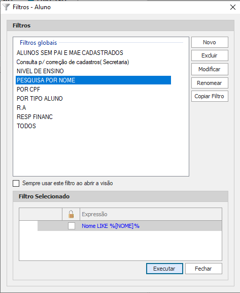 Irá aparecer um filtro, selecione o filtro "Pesquisa por nome" e adicione o nome completo do aluno.