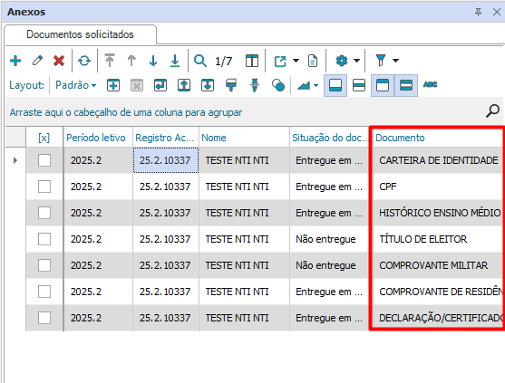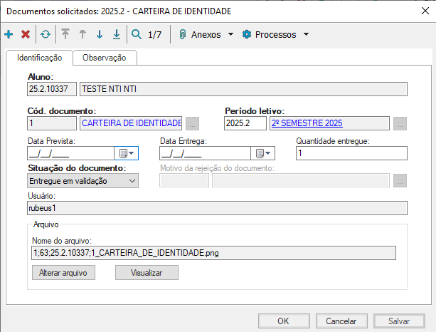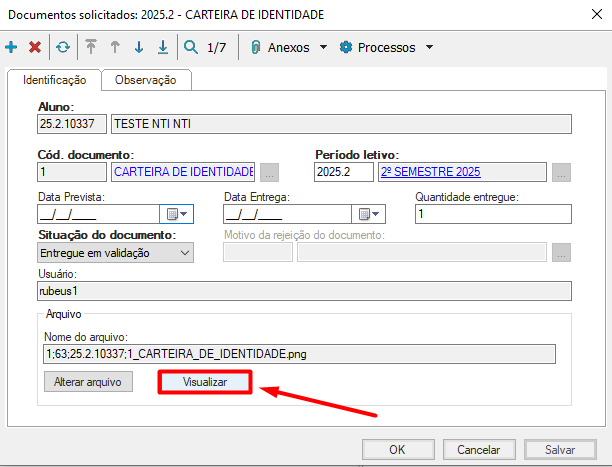 Para alterarmos o status do documento, para o candidato conseguir continuar o processo de matricula, altere a "Situação do documento:" para "Valido".
