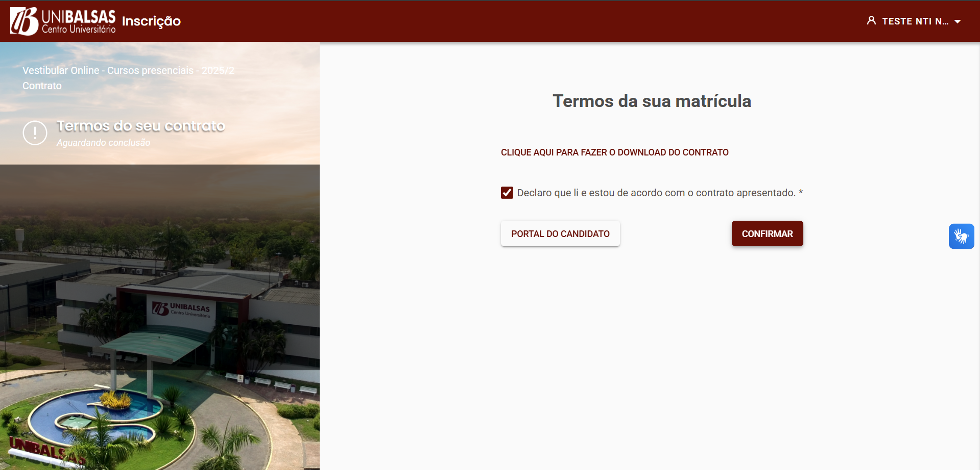O candidato precisa baixar o contrato e depois marcar o quadrado declarando que leu o contrato.