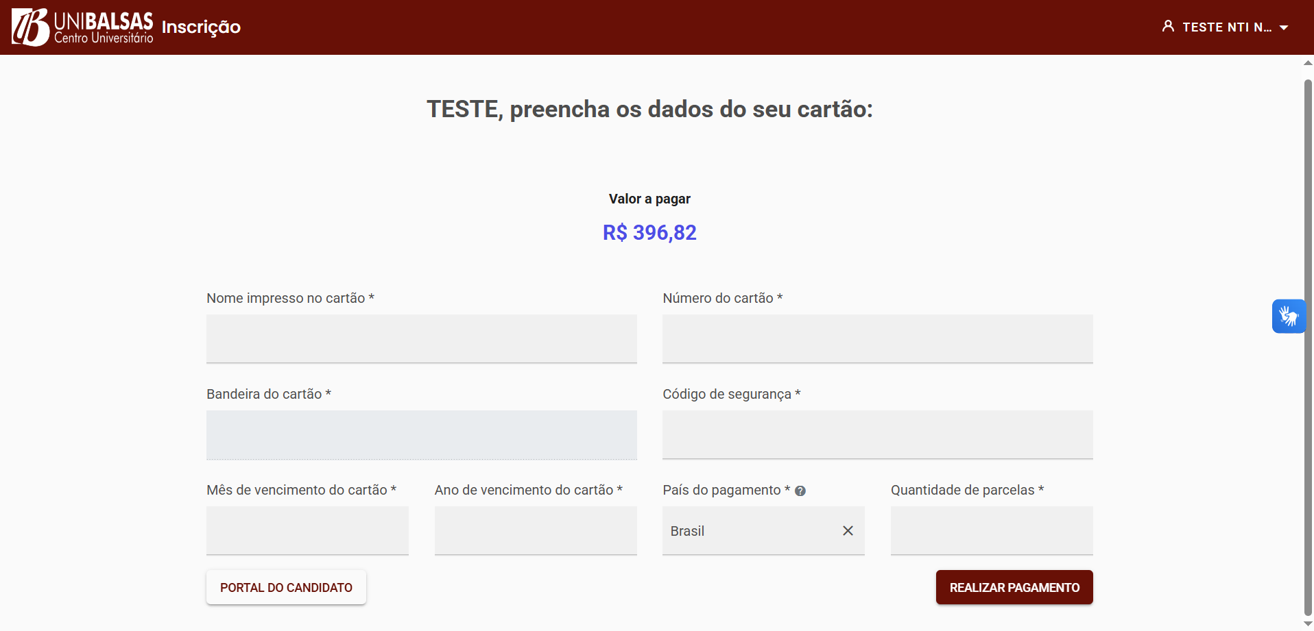 Ao selecionar a opção: Cartão de crédito, aparecerá essa tela.