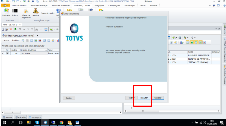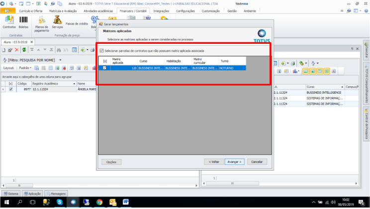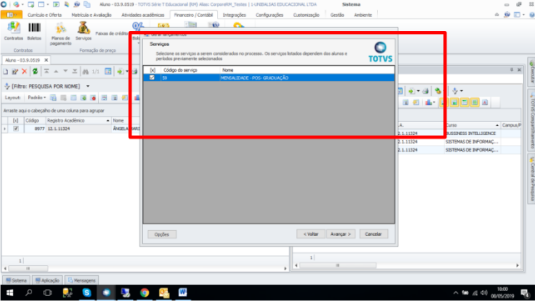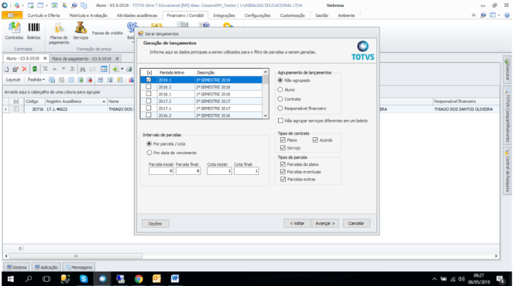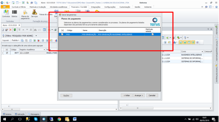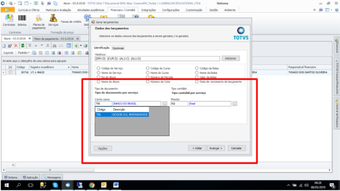 Para a geração de parcelas (lançamentos) para os cursos de Pós Graduação em 2019 utilizará conforme parametrização financeira a conta caixa 756 -SICOOB.